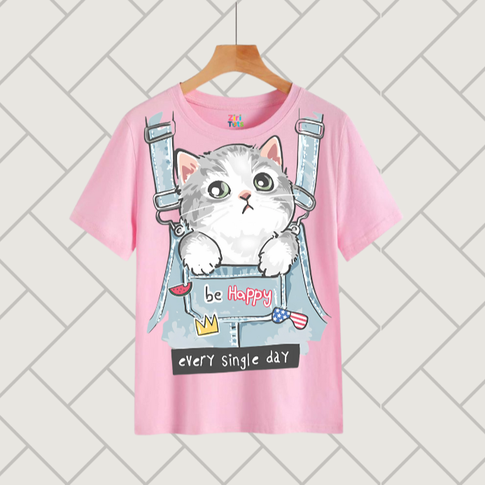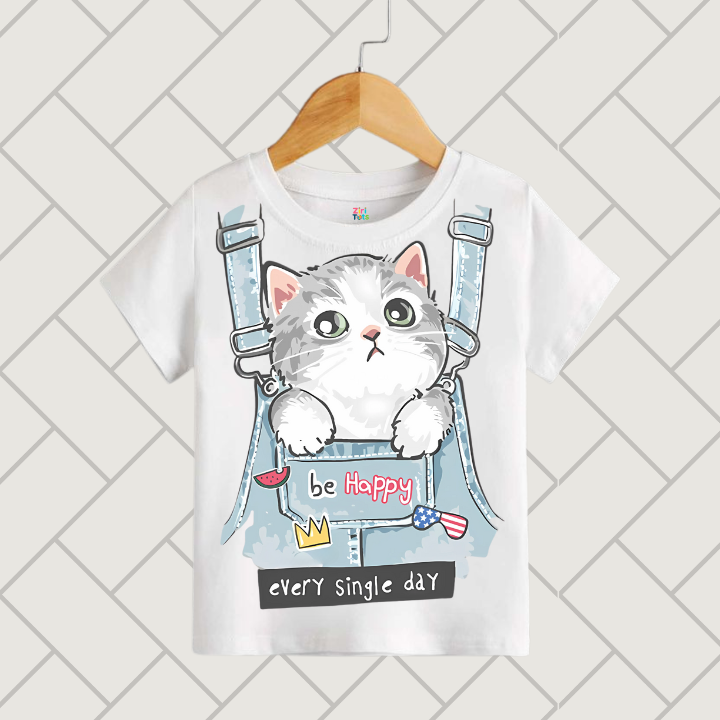 This cute t-shirt features an adorable kitten peeking out from illustrated denim overalls, surrounded by playful details like a crown, heart, and bow. With the cheerful message “be Happy every single day,” it’s perfect for spreading positivity. Soft, comfy, and fun—ideal for casual wear or gifting to cat lovers.