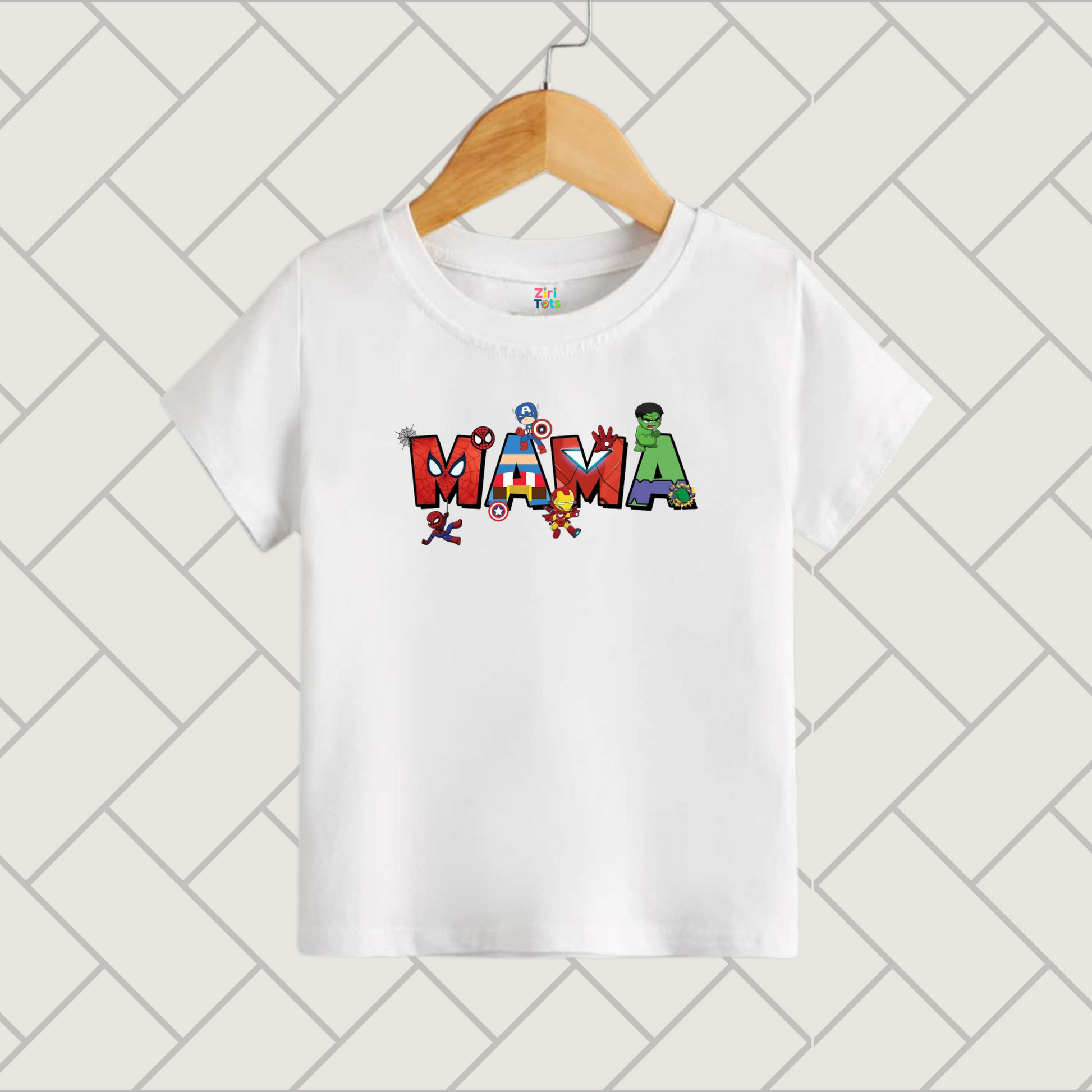 Let your little one celebrate mom in heroic style with this adorable t-shirt featuring fun, cartoon-style Avengers characters. The front spells out “MAMA” using iconic hero elements like Captain America's shield, Spider-Man's web, Iron Man's arc reactor, and Hulk’s strength. The back showcases Iron Man, Spider-Man, Hulk, Captain America, and Thor in a vibrant comic-style print. Perfect for everyday wear or superhero-themed events, this comfy tee is made from soft, breathable fabric for all-day comfort.